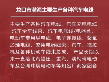 主要生產(chǎn)各種汽車(chē)電線(xiàn)、家用電器線(xiàn)束、汽車(chē)充電電纜、 汽車(chē)全車(chē)線(xiàn)束